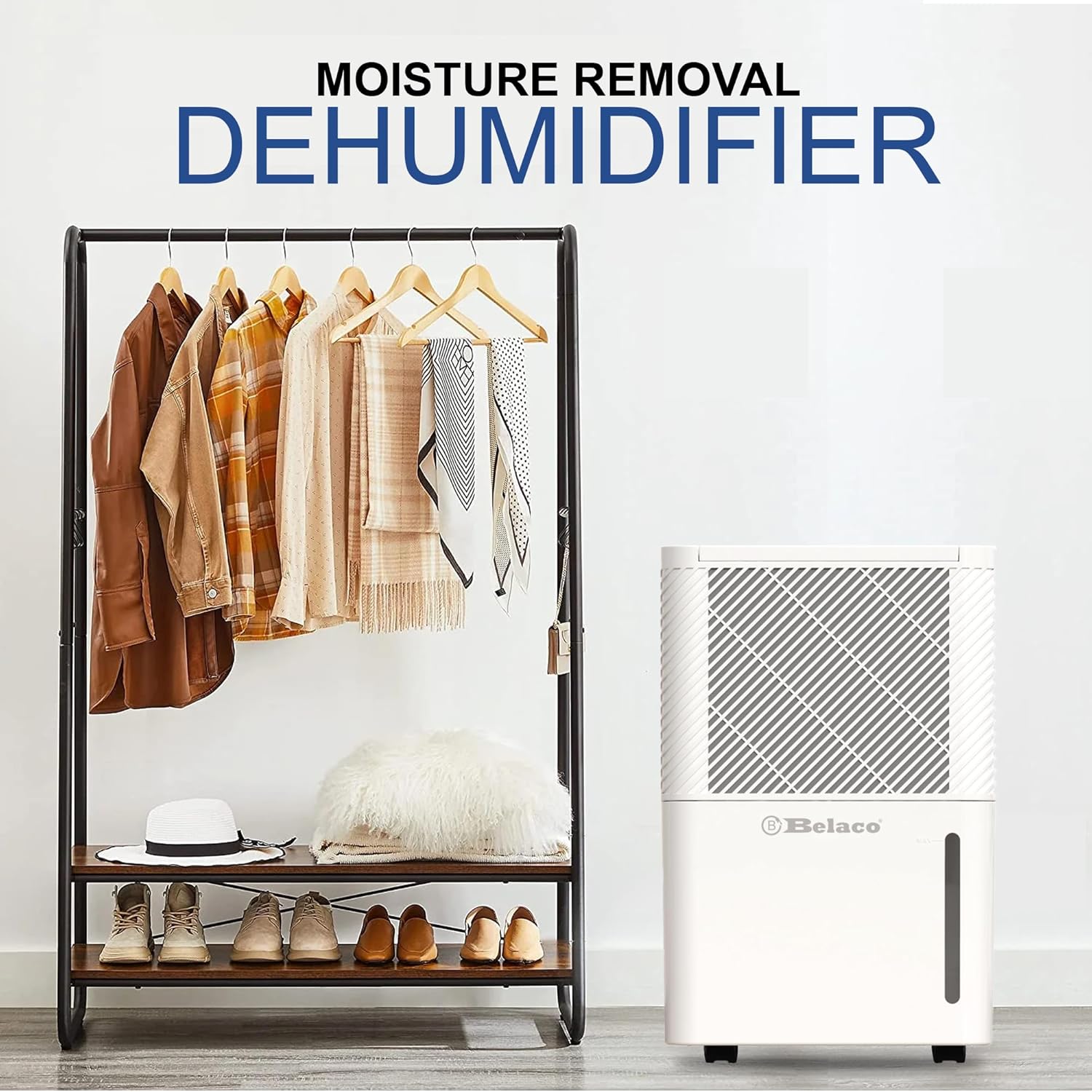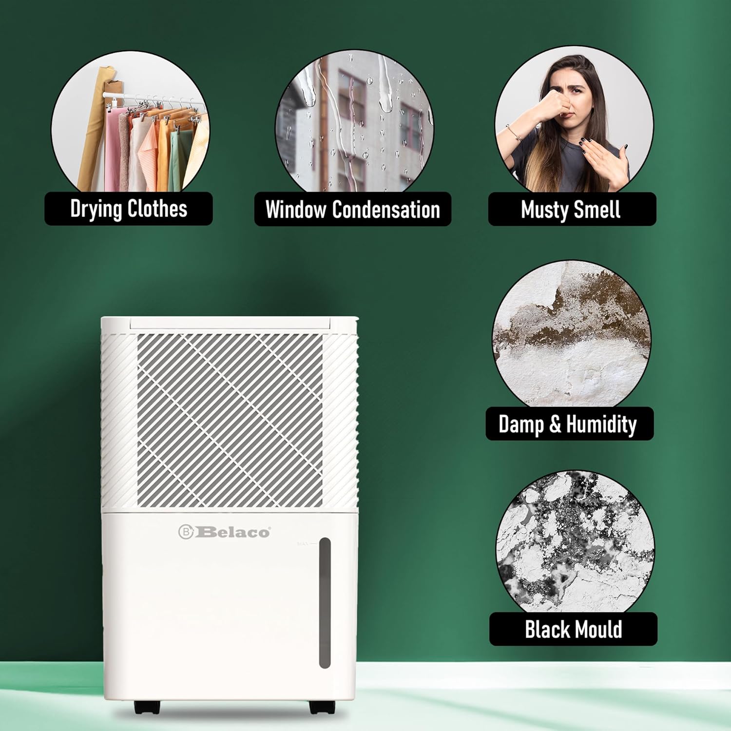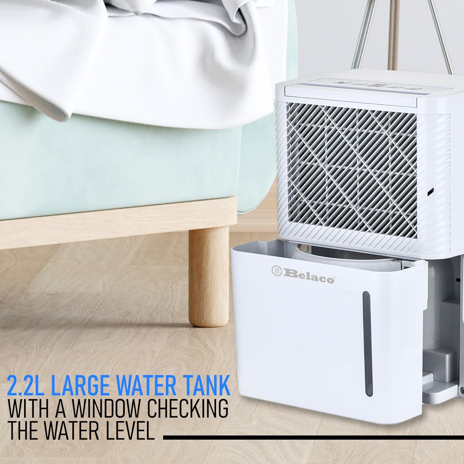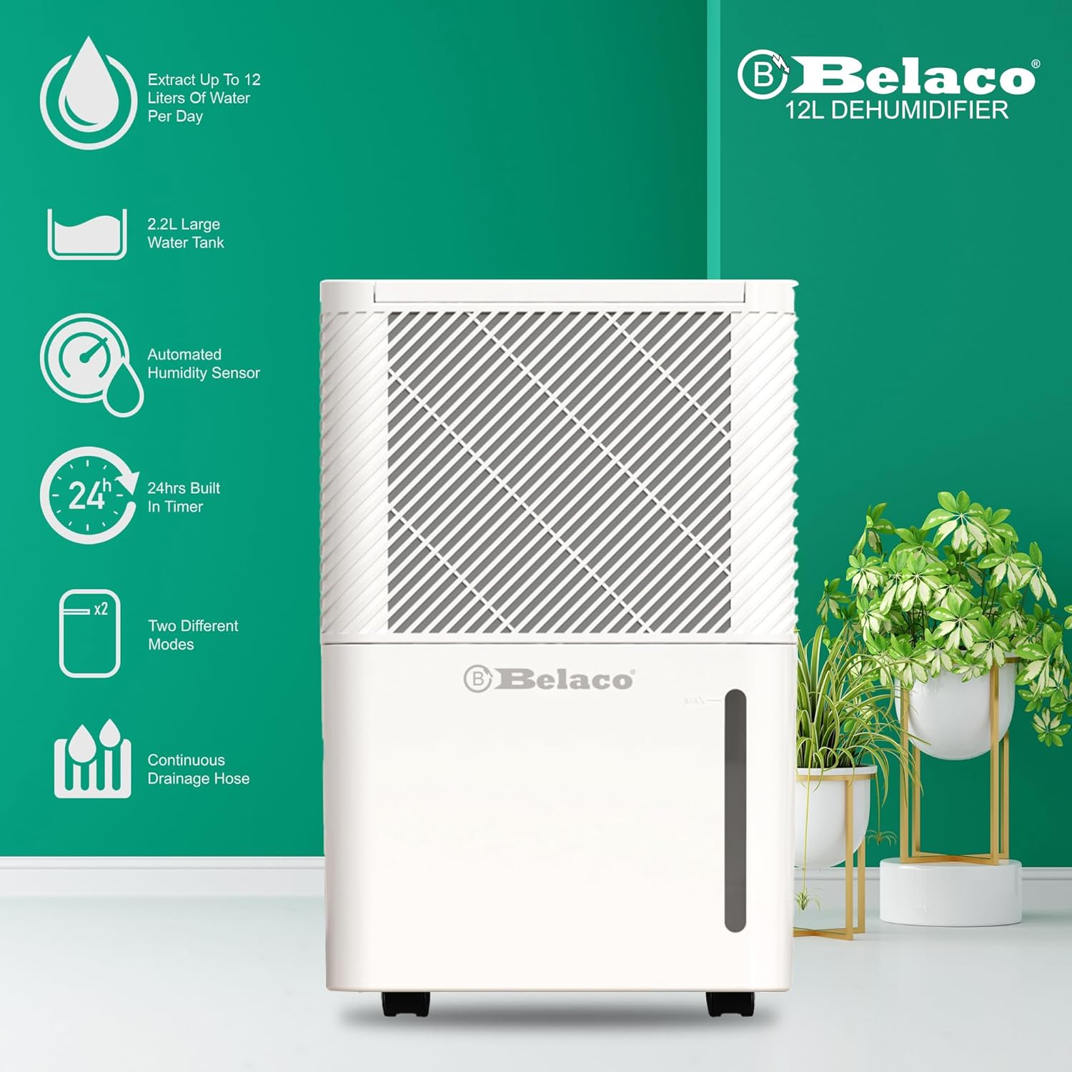 The Belaco 12L/Day Dehumidifier is a powerful yet energy-efficient solution for tackling damp, mold, and excess moisture in your home. With a 12L daily extraction capacity and a 2.2L detachable water tank, it keeps your indoor air fresh and healthy. Designed with a digital display, humidity sensor, and 24-hour timer, it allows full control over settings while ensuring low running costs. Its quiet compressor makes it ideal for bedrooms, offices, or living spaces, while the portable and stylish design fits seamlessly into any room.